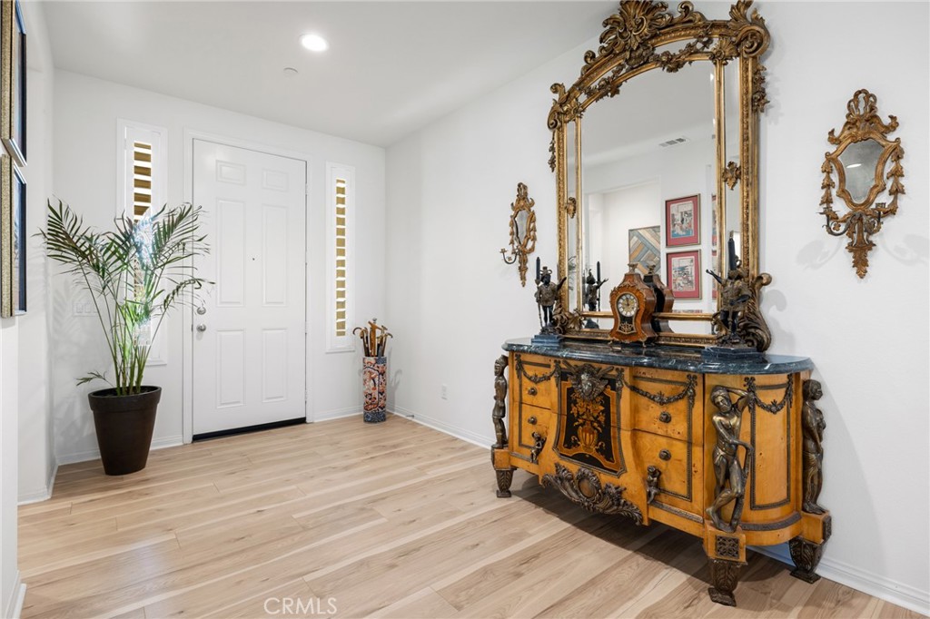 Discover a luxurious lifestyle in the coveted Audie Murphy Ranch in Menifee. This 2023-built home, featuring 4 beds and 3 baths, is enhanced with over $400,000 in premium upgrades. The property captivates with stunning mountain views, an expansive driveway, tasteful landscaping and owned solar on a culd-de-sac. Inside the 3100 sqft home, enjoy high ceilings, natural hickory wood floors, and elegant details like 8-foot doors and plantation shutters. Off the entrance are the two spacious secondary bedrooms boasting upgraded carpet, plantation shutters and gorgeous views. They share a gorgeous jack and jill bath featuring a dual sink vanity with quartz counters, a tub shower combo with new glass doors and upgraded shower head. The large formal dining room leads the way to the butlers pantry boasting GMK signature cabinets with gold finishes and glass fronts over a granite countertop which sits across from the large walk-in pantry. The stunning Chefs kitchen is appointed with high end appliances including a double oven, pot filler, 5 burner stove, farm sink, glass backsplash, coffee bar, 8 foot eat-up island and additional cabinets with black granite counters, a wine fridge, pendant lighting and is open to the large eating nook. The Great Room features a custom marble 3 way fireplace with color changing flames encompassing a 65" TV. Down the hall is the powder bath, and large laundry room boasting a wash sink and cabinets with access to the 3 car garage featuring an EV charger, epoxy floors, Solar batteries and storage. The office boasts custom glass french doors and can easily be a 4th bedroom. The large master is appointed with two huge walk-in closets and an attached bath featuring a quartz dual vanity, and quartz appointed soaking tub and walk-in shower boasting an upgraded shower head. The 12,000 sqft private oasis is breathtaking, from the CA room to the modern stamped concrete with turf in-lays with a 60 foot aluma wood patio cover with a slatted design for and sun shades. The custom ozone pool features pebble tech, Baja step, fountains, stone backsplash and color changing lights with a large spa. The entertainers yard also features a fire pit, artificial turf, surround sound, uplighting, tropical landscaping, an outdoor kitchen and a side yard that was built for tranquility. The community offers pools, spa, trails, club house, meeting rooms, sports courts, and skate park and includes a Middle school and award winning elementary school. See supplements